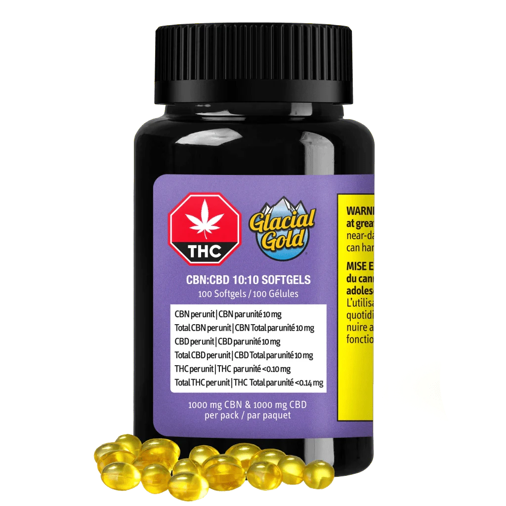 All-natural Glacial Gold CBN:CBD 10:10 Softgels feature certified organic MCT oil derived from coconuts, infused with high-purity CBN isolates & CBD distillates from Nextleaf Labs. Available in value format 100-pack providing 1000mg total CBN and 1000mg total CBD per package.
