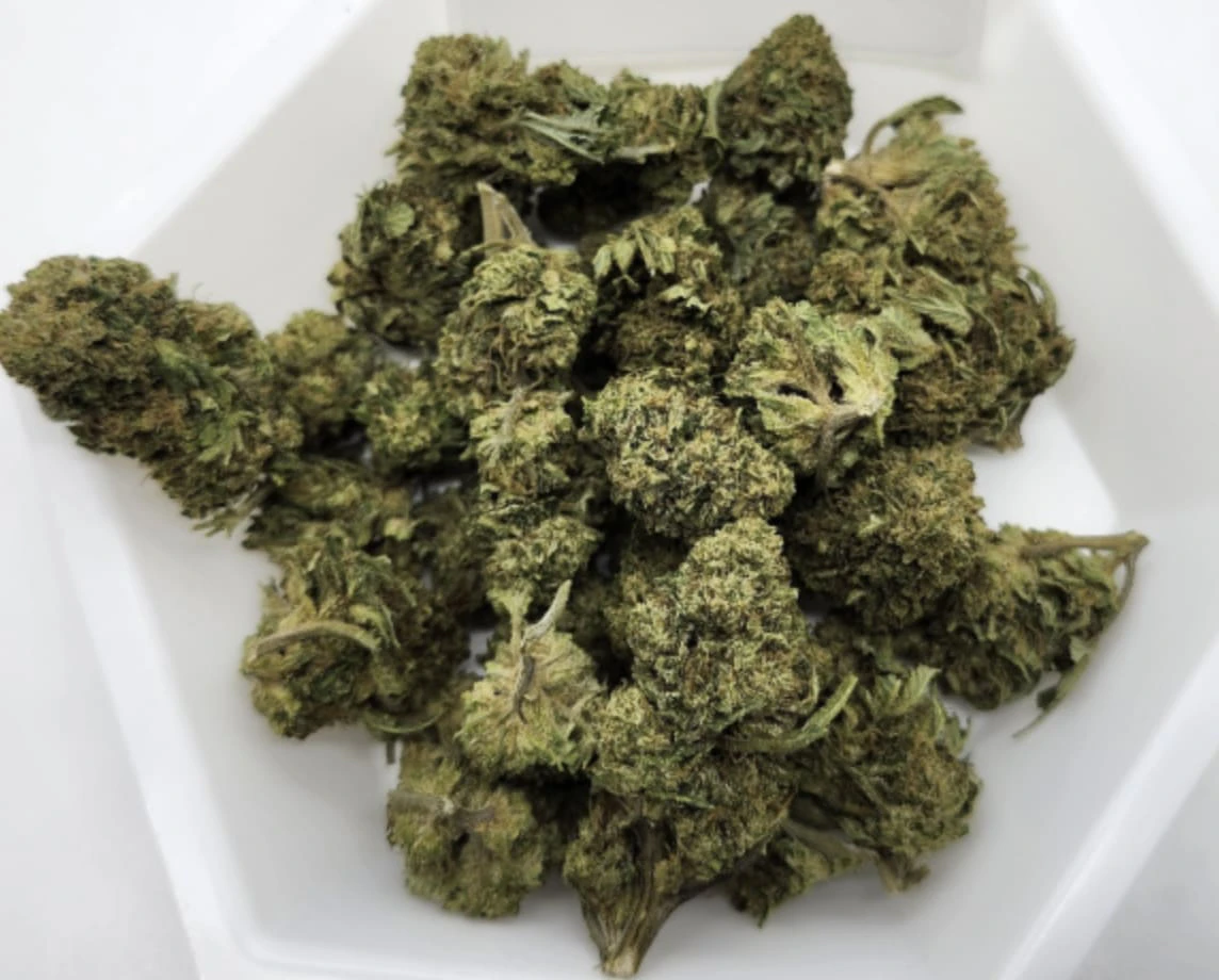 Indica cultivar with dense buds in deep purple and green tones, covered in trichomes. It offers earthy, grape-like aromas with a subtly sweet, herbal flavor.