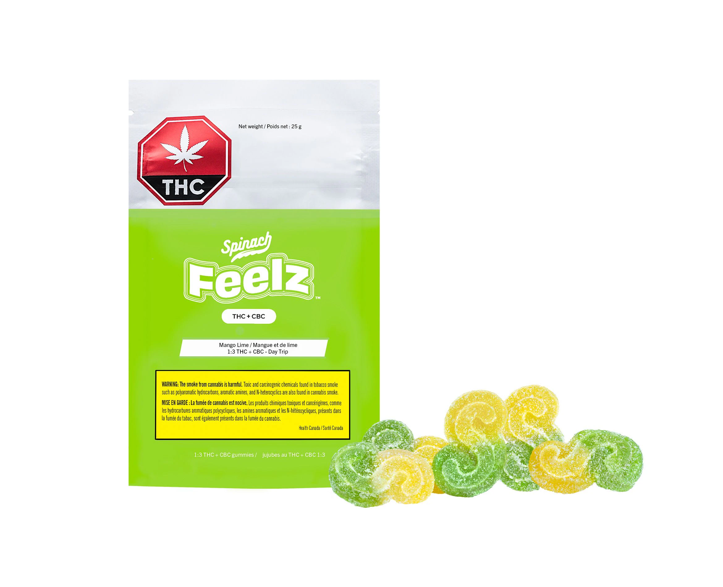 Grab your bag, your friends and get going! A new day’s adventure awaits with Spinach Feelz™ THC+CBC Day Trip gummies. From sun-up to sun-down, feel at ease and in tune with all the scents, sights, and sounds this glorious world has to offer. These one-of-a-kind THC+CBC gummies are packed with delicious mango-lime flavours and are sure to make for good times with friends. Five sour-then-sweet gummies and 10mg THC and 30mg CBC totals per pack. Feelz. The Way You Want.