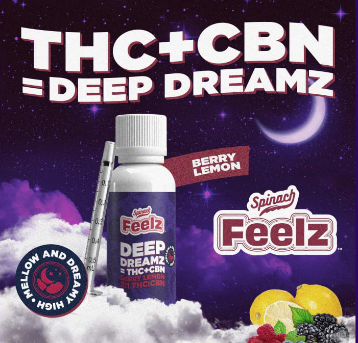 Relax and drift away with Spinach FEELZ™ Deep Dreamz THC+CBN Drops. These delicious drops with mixed berry and lemon flavour notes are ideal for a mellow and dreamy high, thanks to our special blend of THC and rare cannabinoid CBN. Kick back and float on by with Spinach FEELZ™ Deep Dreamz THC+CBN Drops. 30ml of oil that contains 600mg of THC and 300mg of CBN per bottle and can be dropped under the tongue. Feelz. The Way You Want.lt