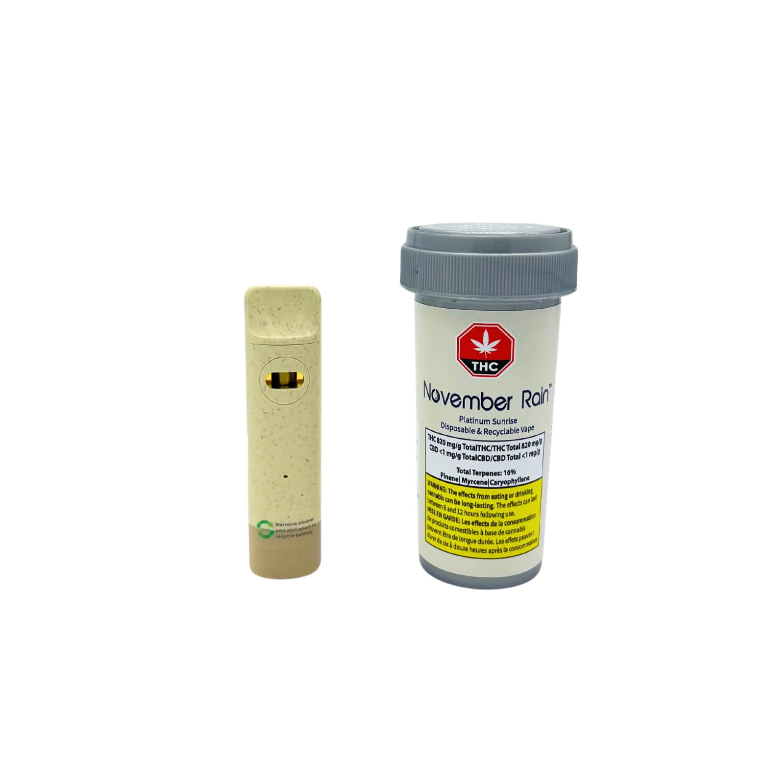 Awaken your senses with the November Rain Biodegradable Recyclable Disposable Vape: Platinum Sunrise, a refreshing and invigorating choice that brightens your day with its unique flavor profile. This 0.5g All-In-One device boasts a remarkable six-month battery life, ensuring that your enjoyment remains seamless and hassle-free. Constructed from biodegradable materials and featuring a recyclable battery, this vape is not only an indulgent experience but also a responsible one, making it perfect for eco-conscious users. The Platinum Sunrise offers a vibrant blend of flavors reminiscent of a sun-kissed morning, lifting your spirits with each delightful inhale. With its focus on sustainability without sacrificing quality, this vape is an excellent addition to any cannabis collection. Coming in at 16% terpenes and 75% THC, it delivers a well-rounded high that strikes the perfect balance between relaxation and energy, making it an ideal companion for any time of day.