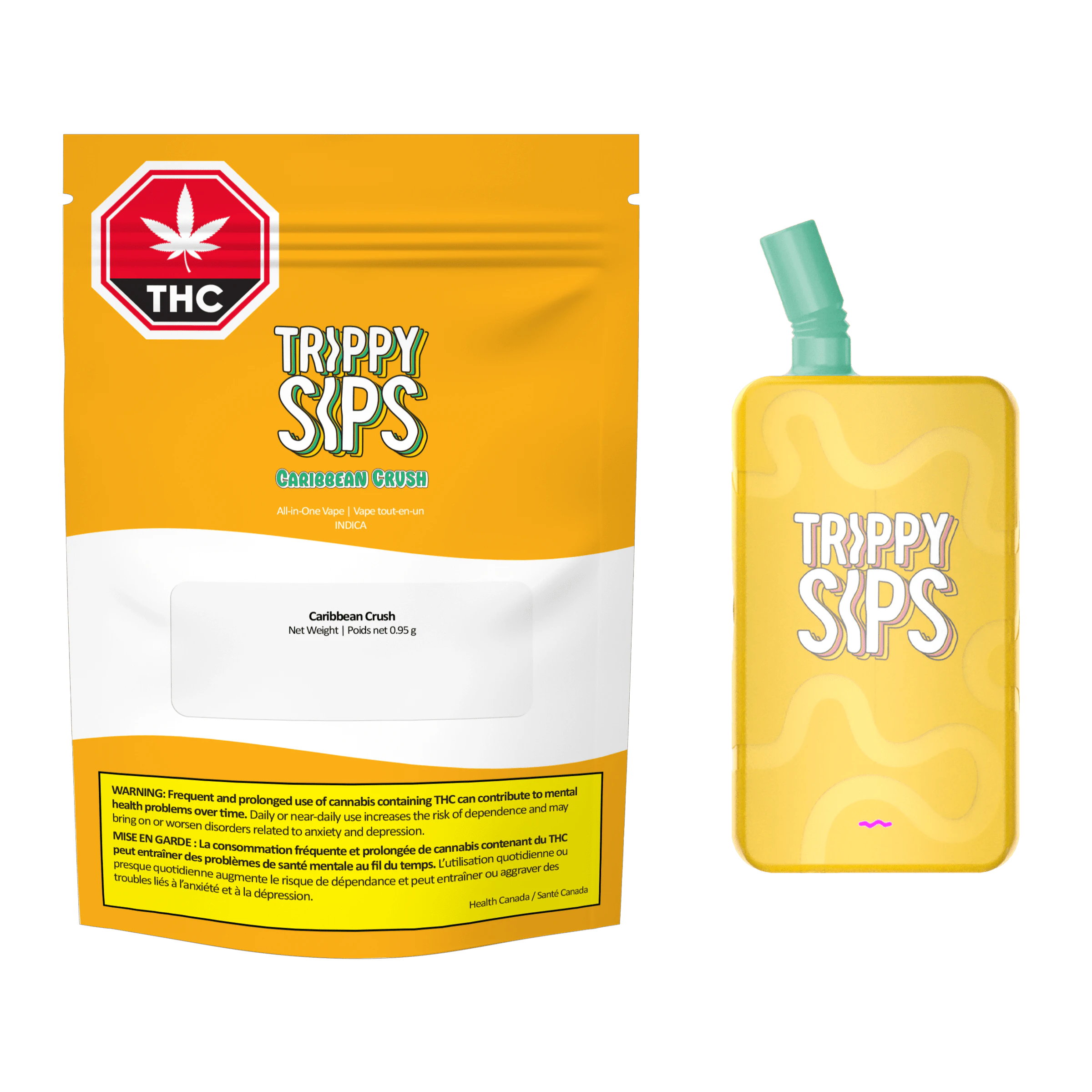 Trippy Sips’ discreet, palm-sized all-in-one vapes are here! Our innovative crinkle straw mouthpiece cools the vapour to give you bigger, better pulls every time. And this vape is rechargeable so you can savour the 0.95g of high potency THC distillate with the light and refreshing taste of tropical mangoes and pineapple in our Caribbean Crush flavour.